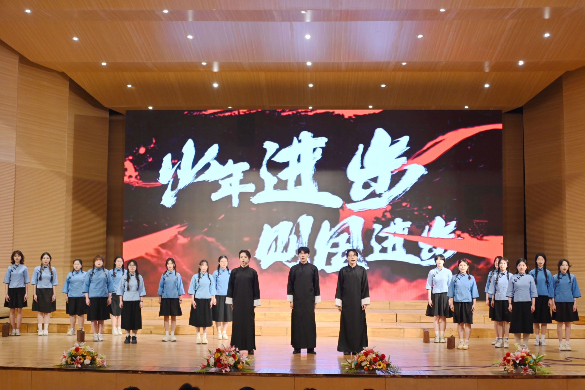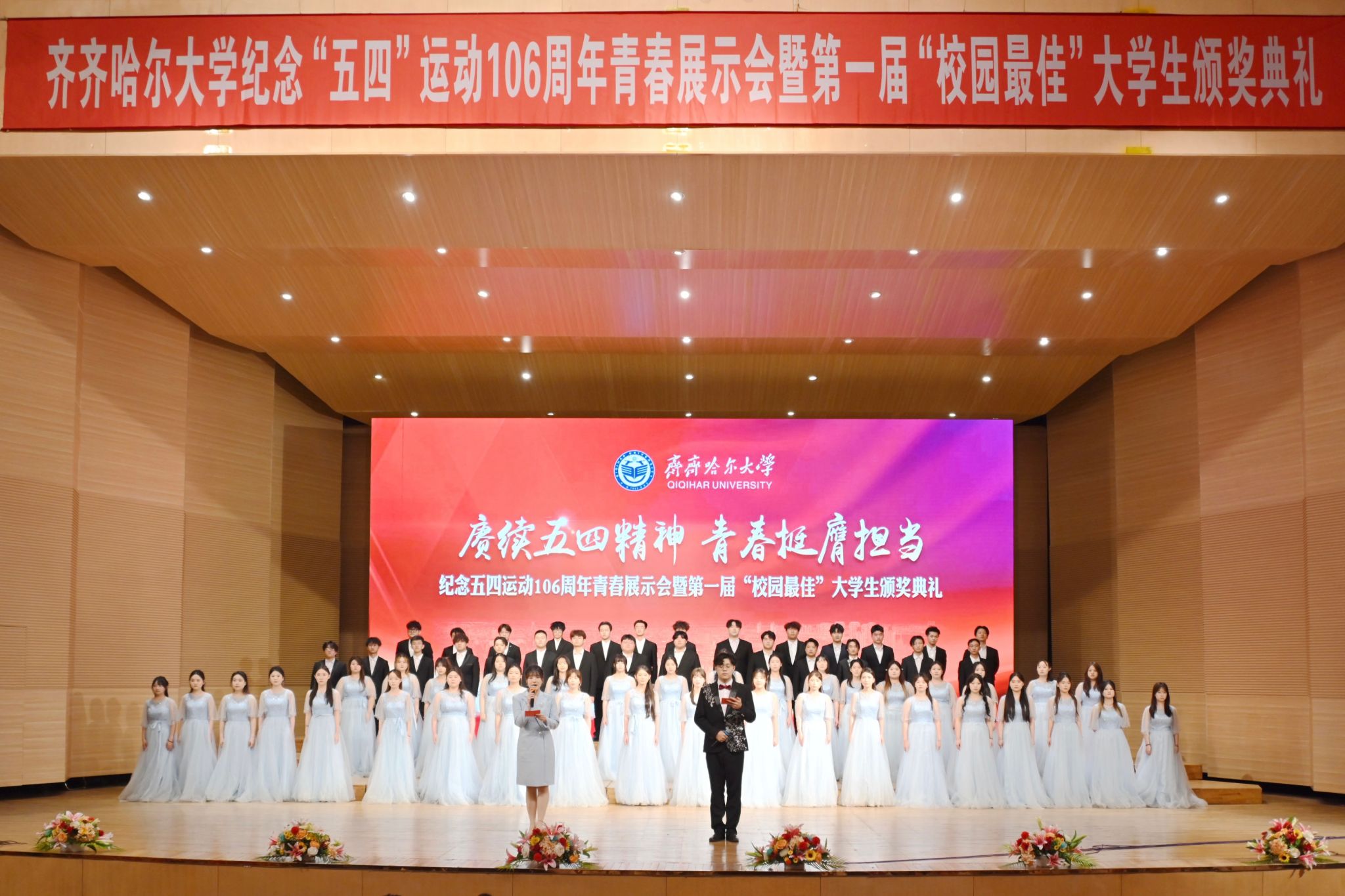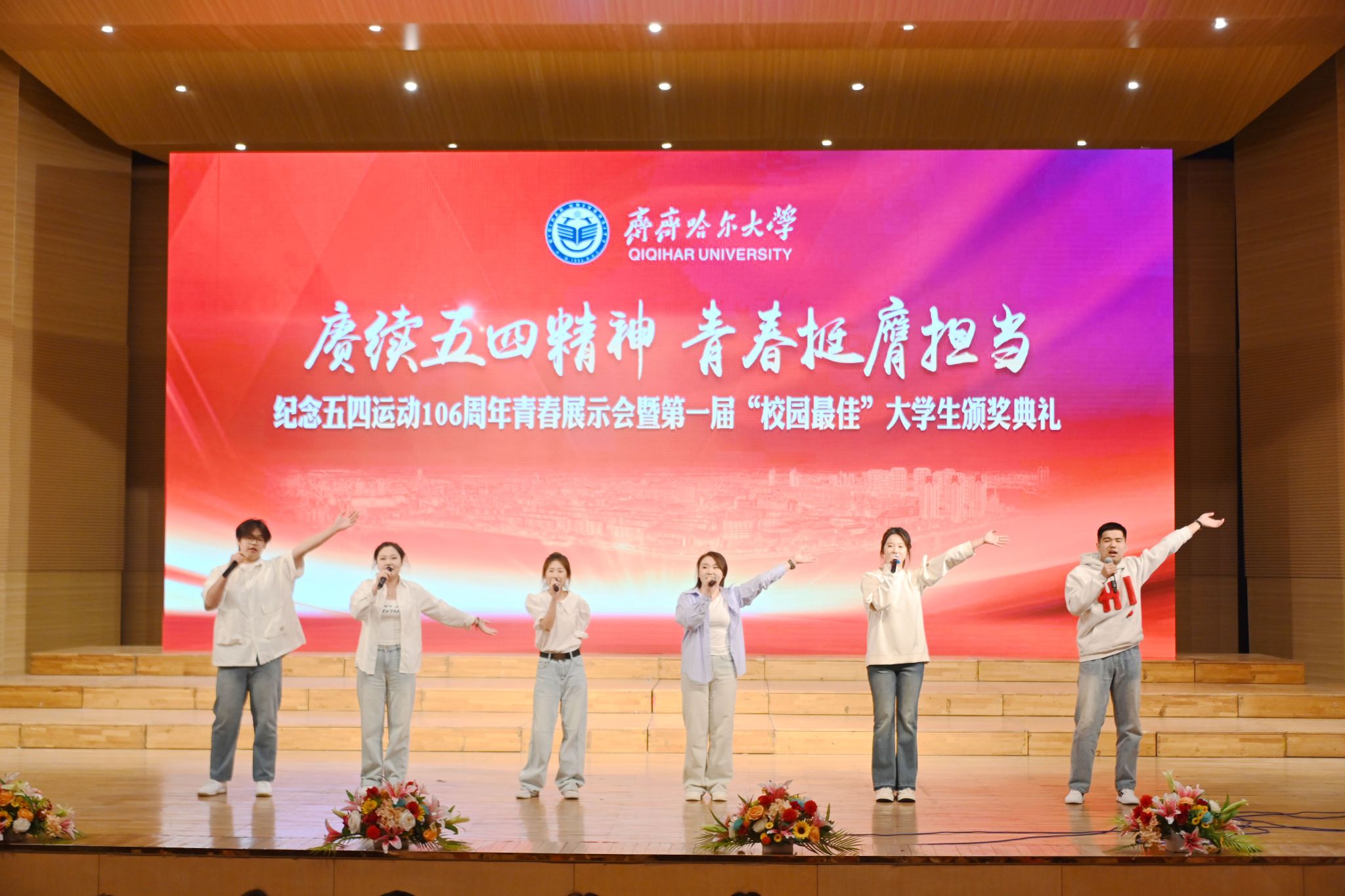 本場活動共分三個單元。在“傳承·薪火——致敬百年五四精神”單元中,校舞蹈團的同學們以舞蹈《烈火中永生》拉開序幕,通過藝術形式再現革命先輩的奮斗精神,現場觀眾在光影交錯中感受五四精神的薪火相傳。校青年宣講團的同學們以音詩畫表演《如愿》,帶領觀眾穿越時空,感受歷史與青春的碰撞,見證夢想與奮斗的交融,展現出齊大學子傳承五四薪火的生動圖景。