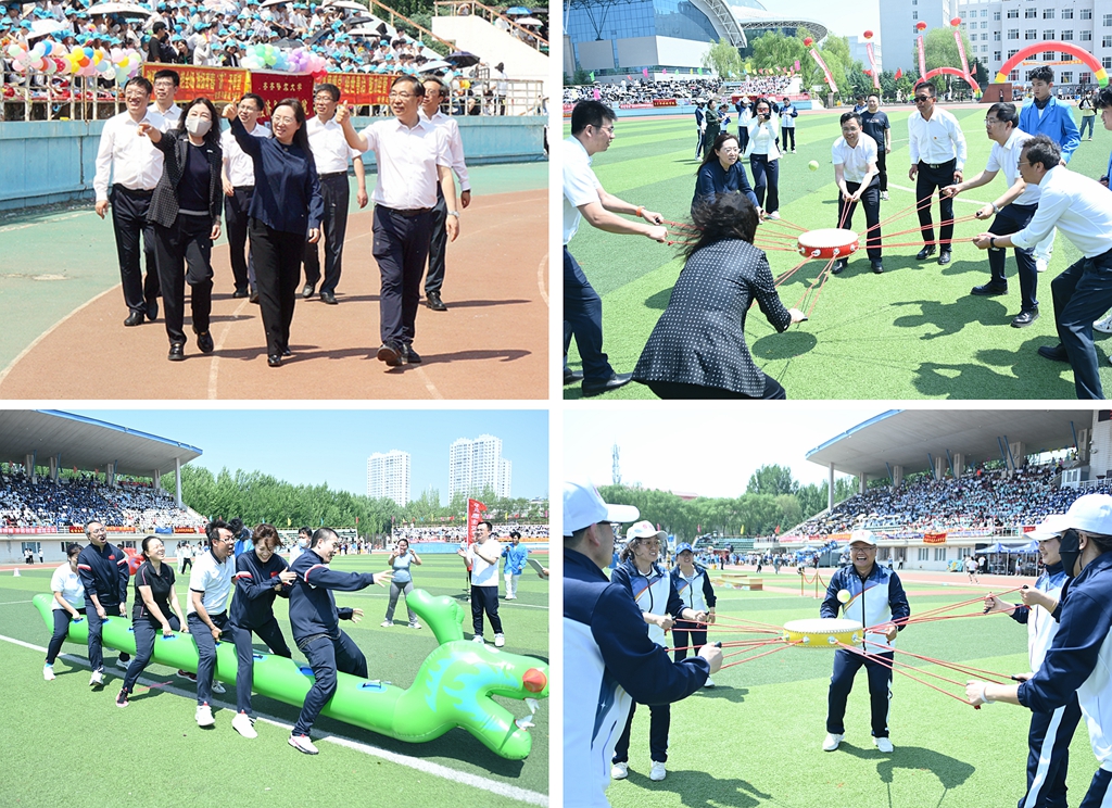 開幕式上,校工會精心組織的教職工集體趣味項目“旱地龍舟”和“同心鼓”精彩上演。教師們齊心協(xié)力,在“左右左”的口號聲中駕馭彩色“龍舟”破浪前行,在鼓點與排球共舞的韻律中展現(xiàn)默契配合。校領(lǐng)導也走進賽場與教職工一同參與游戲,歡聲笑語間,師者風采與團隊精神相得益彰,在校領(lǐng)導帶頭參與的示范下,書寫了校園文化建設(shè)“上下同心” 的生動篇章。