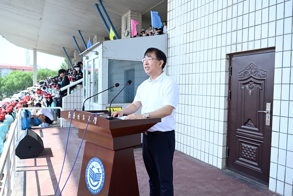 校長、黨委副書記郝文斌致開幕詞,他指出,學校深入貫徹習近平總書記關(guān)于體育的重要論述,全面貫徹黨的教育方針,高度重視體育工作,積極開展豐富活動提升師生身體素質(zhì)與健康水平。新時代新征程,學校以加快建設(shè)體育強國為指引,堅持“健康第一”教育理念,構(gòu)建“五育并舉”育人體系,善用科技賦能體育,助力師生在體育運動中享受樂趣、增強體質(zhì)、錘煉意志,追求卓越競技精神。希望全校師生將“頑強拼搏、超越自我”的體育精神融入日常,在實現(xiàn)個人夢想與民族復(fù)興的同頻共振中,書寫屬于新時代齊大人的華彩樂章!