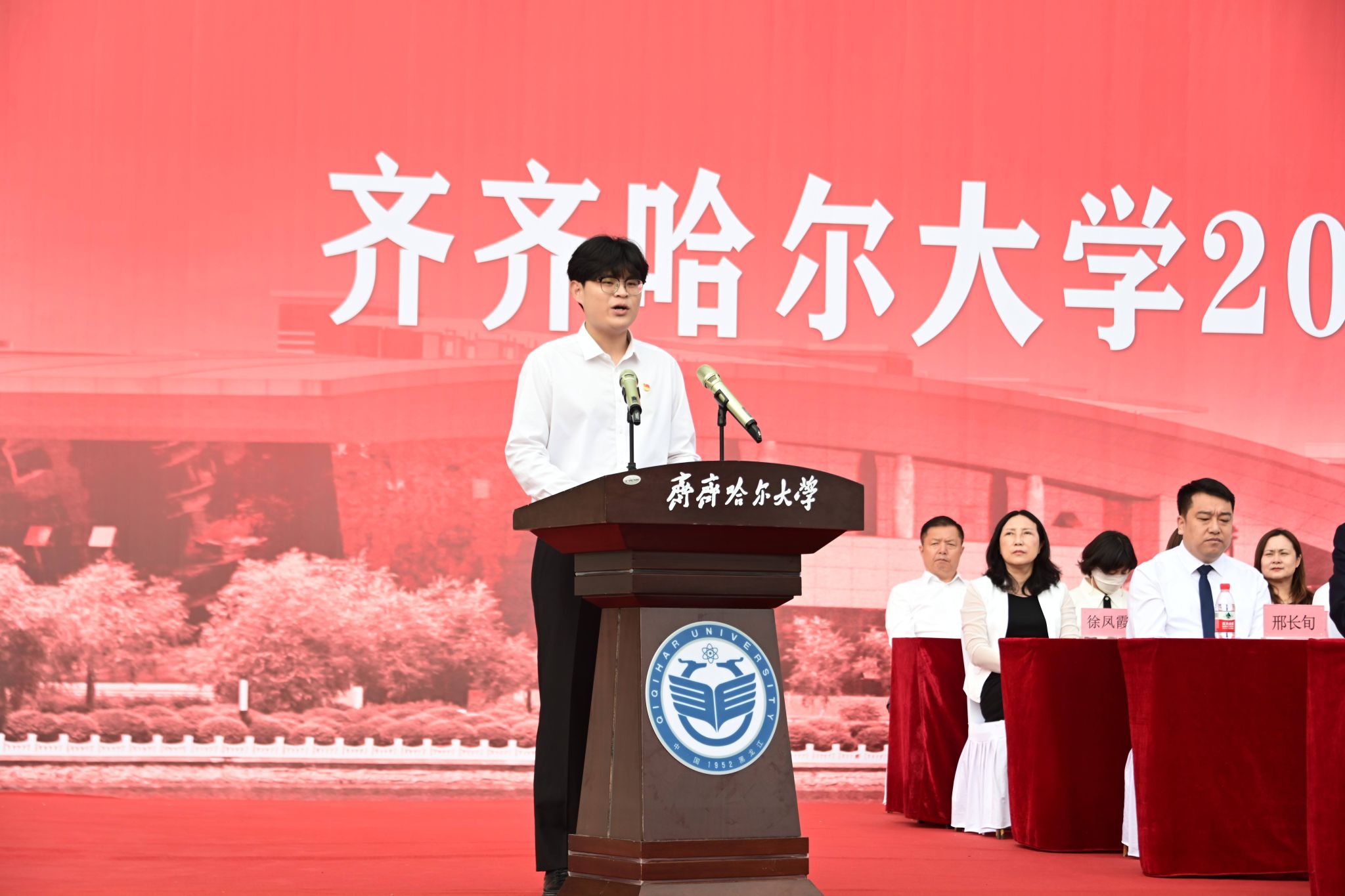 校領(lǐng)導(dǎo)為2025級(jí)新生代表佩戴校徽。閃亮的校徽,標(biāo)志著新生們正式成為“齊大人”,承載著學(xué)校的殷切期望,秉持“養(yǎng)正毓德 精存自生”校訓(xùn)精神,在腳踏實(shí)地的接續(xù)奮斗中建功立業(yè),努力成長(zhǎng)為擔(dān)當(dāng)民族復(fù)興大任的時(shí)代新人。