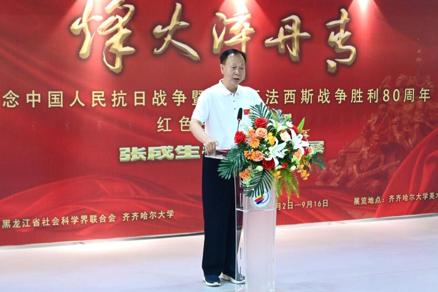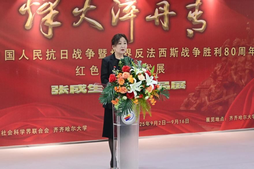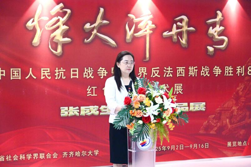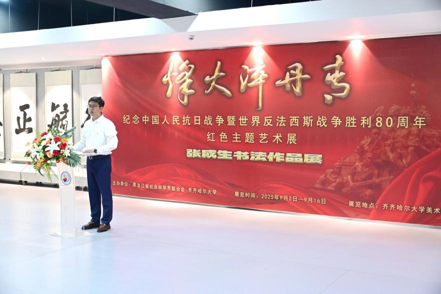 黨委書記丁宏代表學(xué)校向張成生先生致以崇高的敬意!她表示,歷史是最好的教科書,也是最好的清醒劑。唯有銘記苦難輝煌,方能扛起復(fù)興重任。作為扎根黑土地、傳承武裝抗日第一槍歷史、肩負(fù)文化自信自強(qiáng)重任的綜合性大學(xué),我們在這個(gè)莊嚴(yán)的日子舉辦紅色主題書法展,旨在通過藝術(shù)的視角重述抗戰(zhàn)史詩、詮釋抗戰(zhàn)精神,讓師生們在欣賞藝術(shù)之美、文化之韻的同時(shí),重溫民族記憶、緬懷革命先烈、砥礪家國情懷,這不僅是一次不忘來路的深情回望,更是一次啟迪未來的鄭重前瞻。希望本次展覽能夠以生動(dòng)的文化實(shí)踐,為師生上一堂觸及靈魂的“大思政課”,在歷史教育和精神洗禮中,以文化鑄魂,以行動(dòng)踐行,在傳承中尋求突破,在奮斗中實(shí)現(xiàn)成長,努力成為優(yōu)秀的文化傳承者和合格的時(shí)代答卷人。