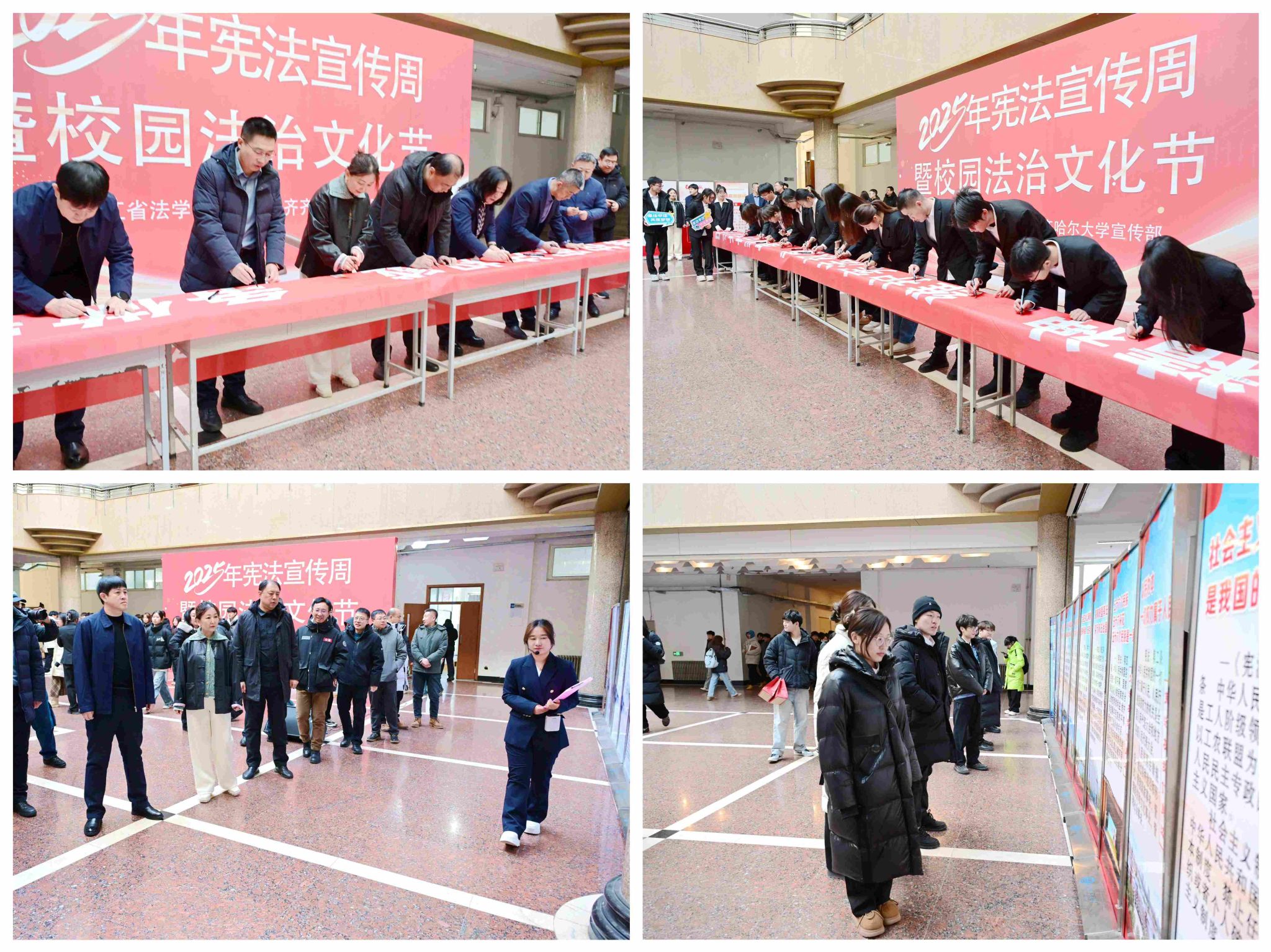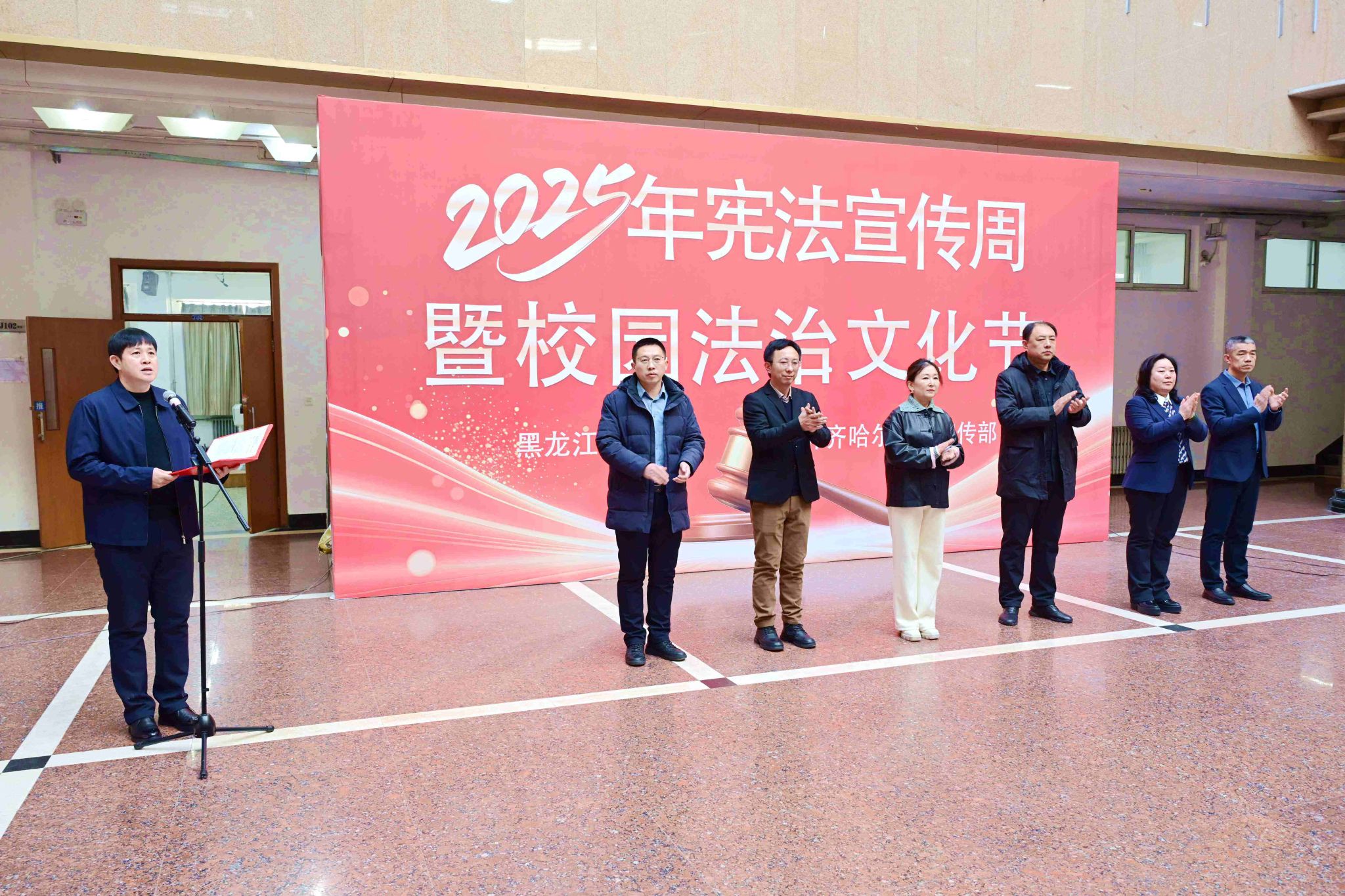 為認(rèn)真貫徹黨的二十大和二十屆歷次全會(huì)精神,深入學(xué)習(xí)宣傳習(xí)近平法治思想,弘揚(yáng)社會(huì)主義法治精神,大力加強(qiáng)憲法宣傳教育,提升師生法治素養(yǎng),在第十二個(gè)國(guó)家憲法日即將到來之際,12月2日中午,學(xué)校2025年“憲法宣傳周”暨校園法治文化節(jié)開幕式在西區(qū)守正樓陽光大廳舉行,校黨委副書記、工會(huì)主席齊宏偉出席并致辭,黨委常委、宣傳部部長(zhǎng)杜海權(quán)主持,相關(guān)職能部門負(fù)責(zé)人、師生代表百余人參加。
