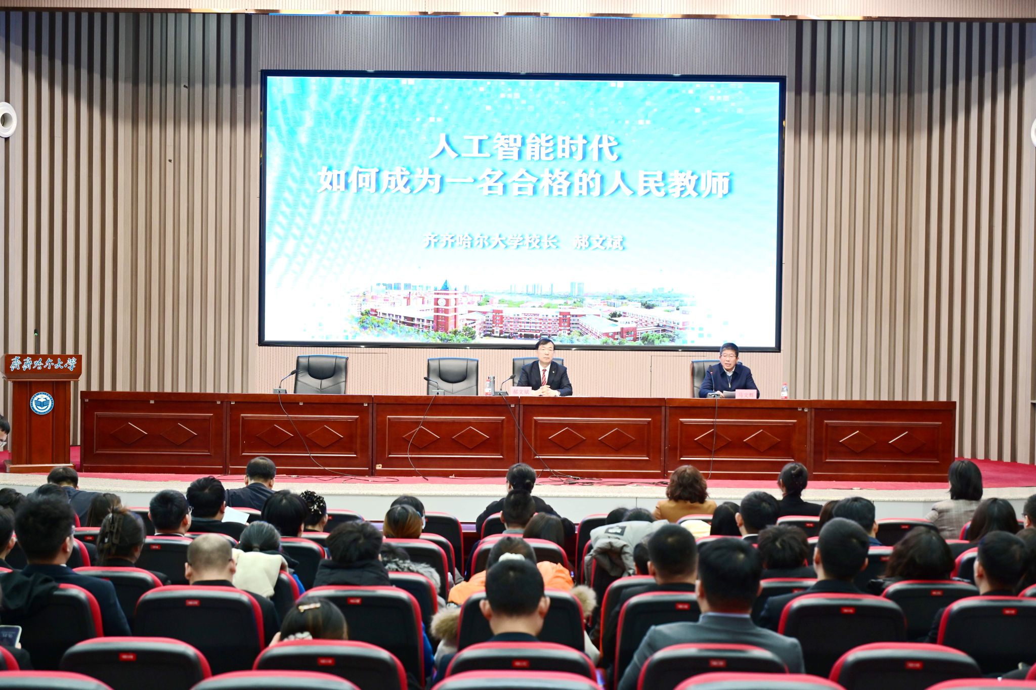 12月24日下午,2025年新教師入職培訓第一講在學校日新大廈四樓報告廳舉行。校長郝文斌以“人工智能時代,如何成為一名合格的人民教師”為題為新入職教師作專題輔導。2025年全體新入職教師參加了培訓,培訓由副校長馬文輝主持。