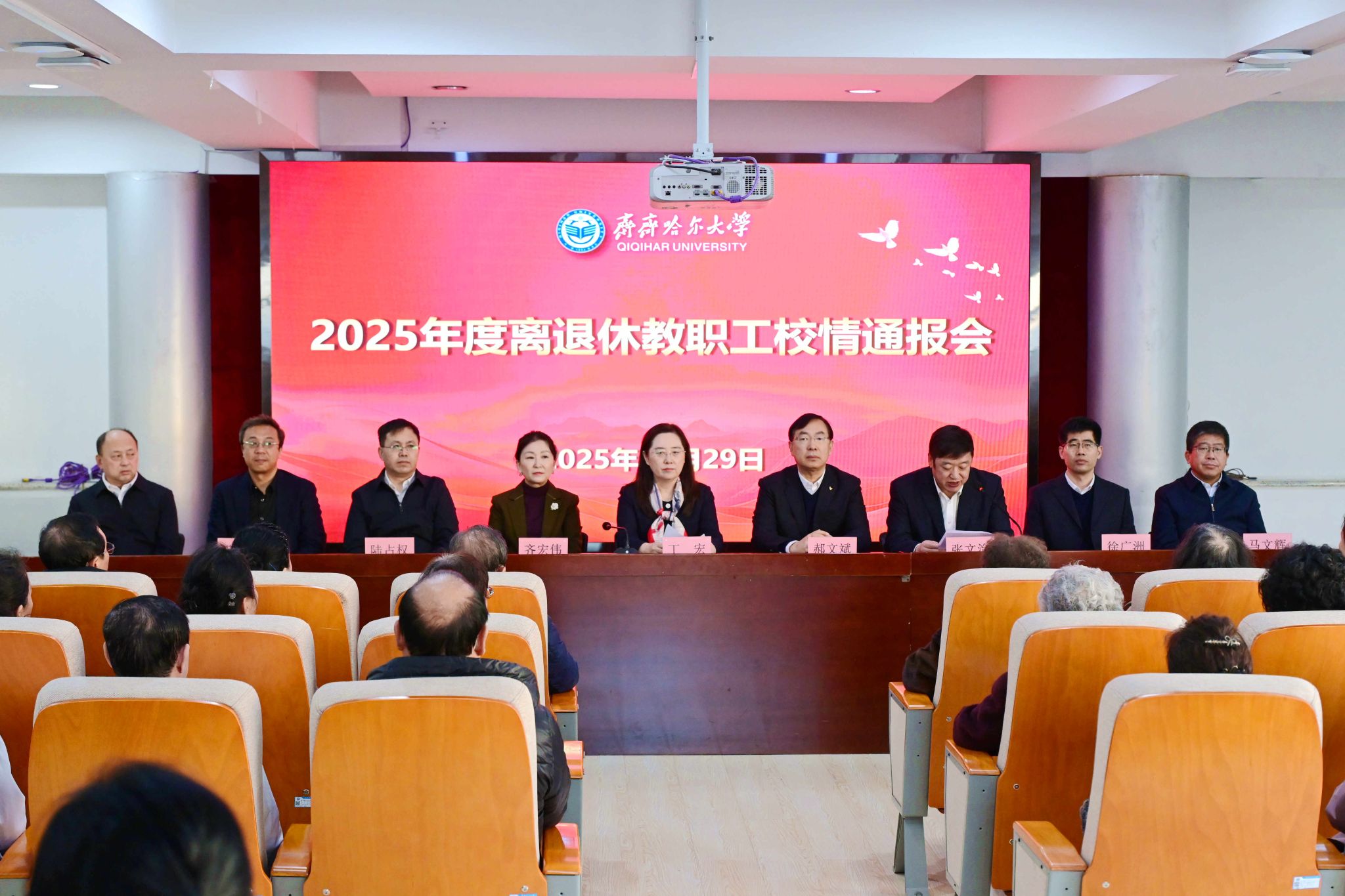 會(huì)上,丁宏從學(xué)校黨的建設(shè)、教育教學(xué)、科研創(chuàng)新、學(xué)科建設(shè)、師資隊(duì)伍、文化建設(shè)、對(duì)外辦學(xué)、民生保障、離退休工作等多個(gè)維度,系統(tǒng)回顧了本年度學(xué)校的發(fā)展情況與豐碩成果。她指出,一年來(lái),國(guó)家部委、省委省政府等上級(jí)領(lǐng)導(dǎo)先后來(lái)校調(diào)研指導(dǎo),對(duì)學(xué)校辦學(xué)治校成效給予充分肯定。這些成績(jī)的取得,離不開(kāi)上級(jí)主管部門(mén)的正確領(lǐng)導(dǎo),離不開(kāi)廣大離退休老同志的親切關(guān)懷與鼎力支持,更凝結(jié)著全體齊大人的智慧與汗水。她期盼各位前輩初心如磐、余熱生輝,繼續(xù)發(fā)揮智囊作用,常為學(xué)校發(fā)展建言獻(xiàn)策、悉心指導(dǎo),一如既往關(guān)心支持學(xué)校建設(shè)發(fā)展,與全校師生同心同德、攜手并肩,共克發(fā)展難題、共譜奮進(jìn)新篇。學(xué)校黨委將始終高度重視離退休工作,切實(shí)做到政治上尊重、思想上關(guān)心、生活上照顧、精神上關(guān)懷,用心用情做好新時(shí)代離退休工作,多為老同志辦實(shí)事、做好事、解難事,讓老同志安心、暖心、舒心,安享幸福晚年。