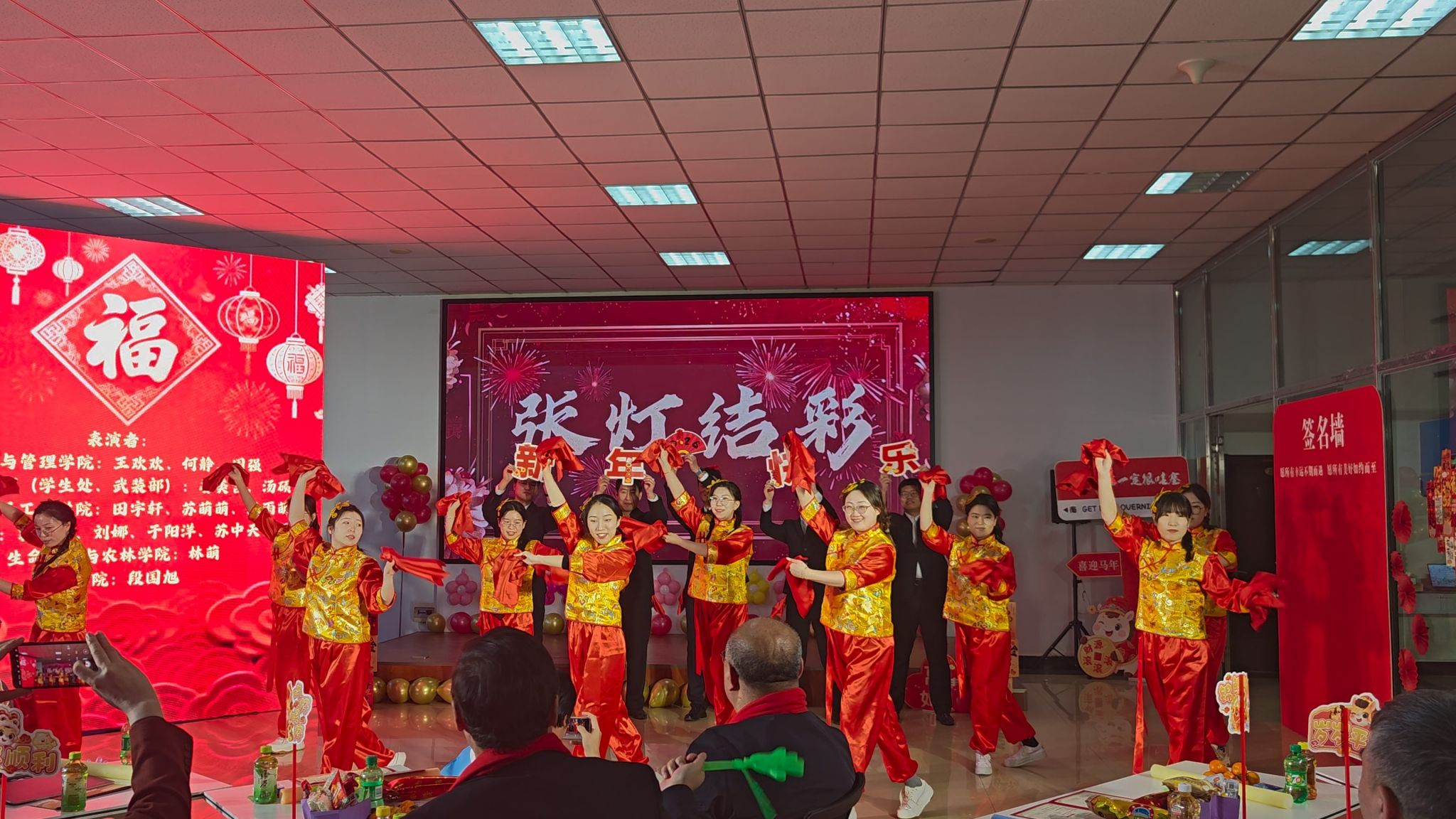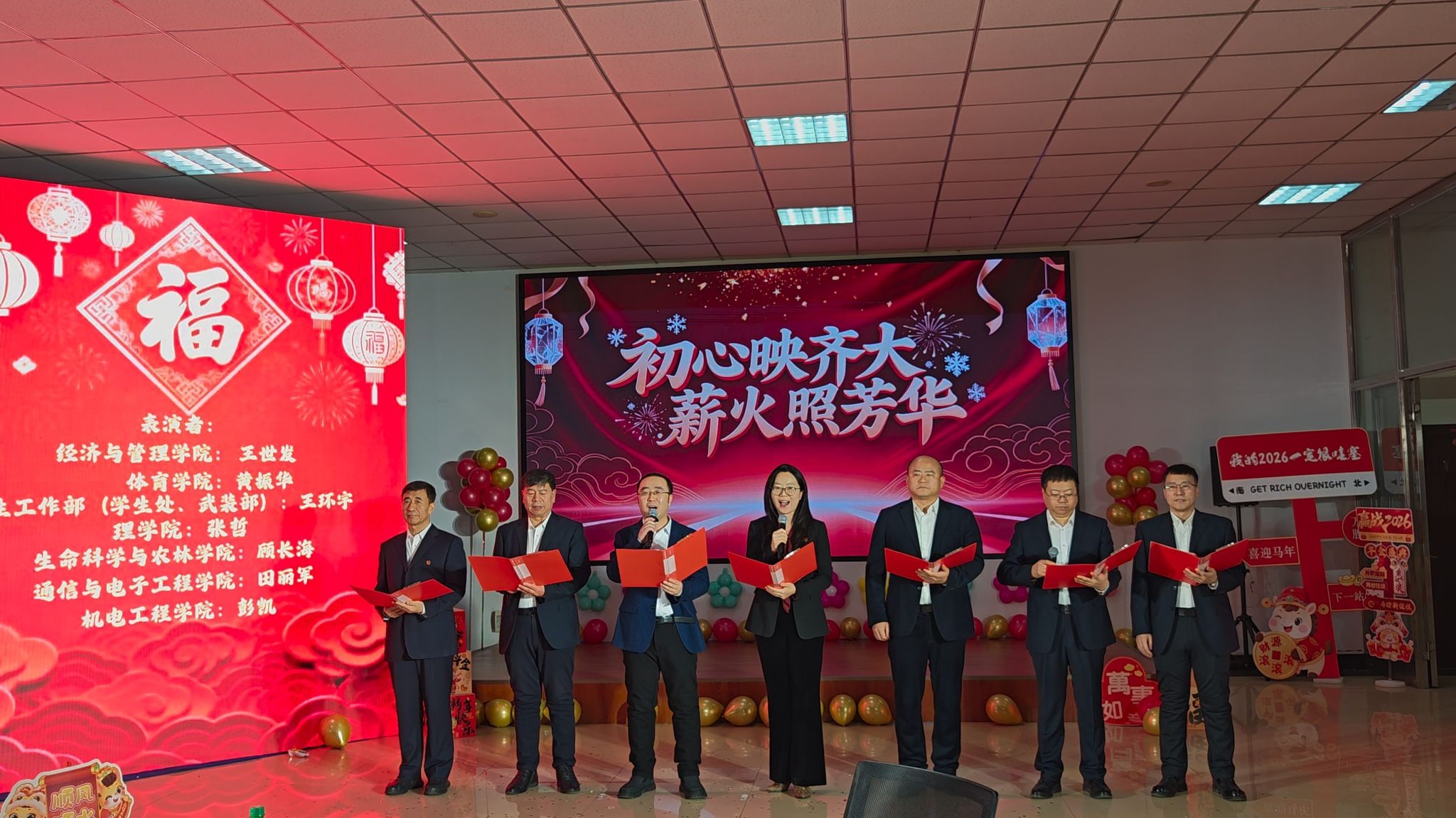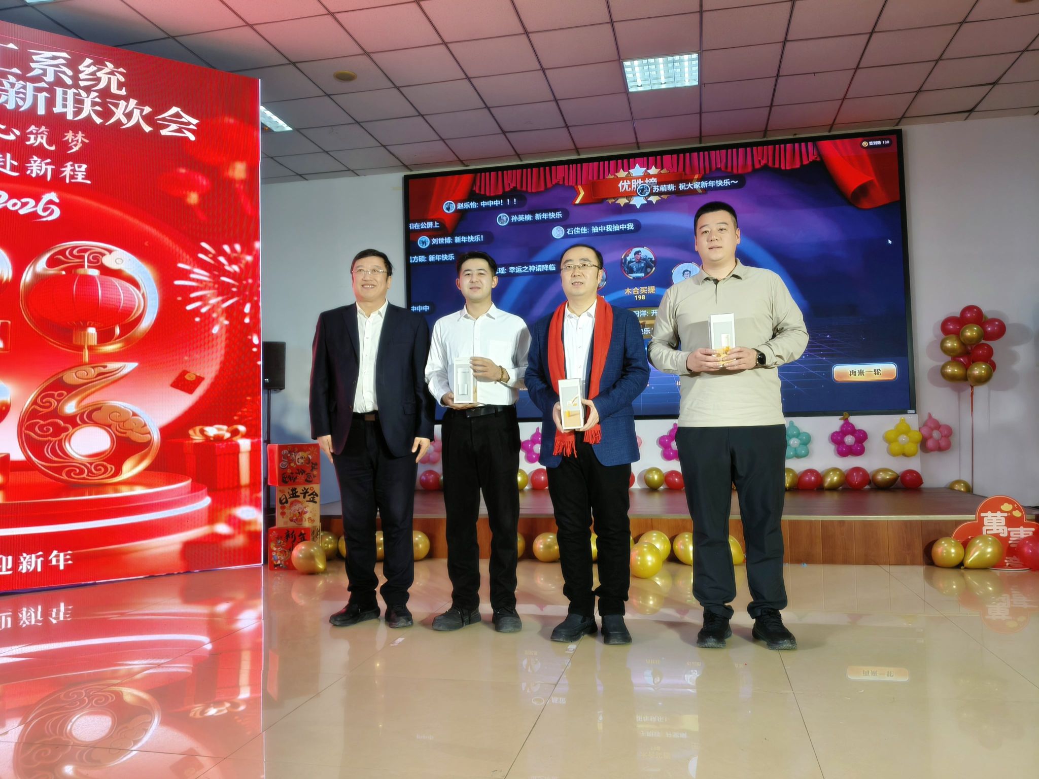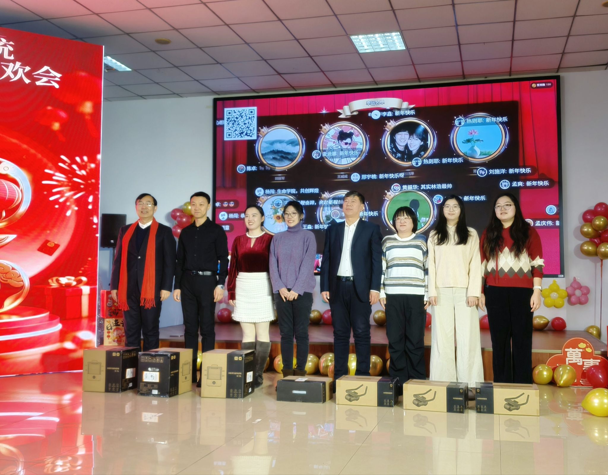 整場聯(lián)歡會高潮迭起,精彩不斷,穿插其間的游戲互動與幸運抽獎環(huán)節(jié)更是增添了濃濃的新年喜慶氛圍。校領(lǐng)導(dǎo)為現(xiàn)場互動環(huán)節(jié)里喜中幸運獎的輔導(dǎo)員頒發(fā)了紀(jì)念禮品,聯(lián)歡會在《相親相愛一家人》的大合唱中圓滿落幕。