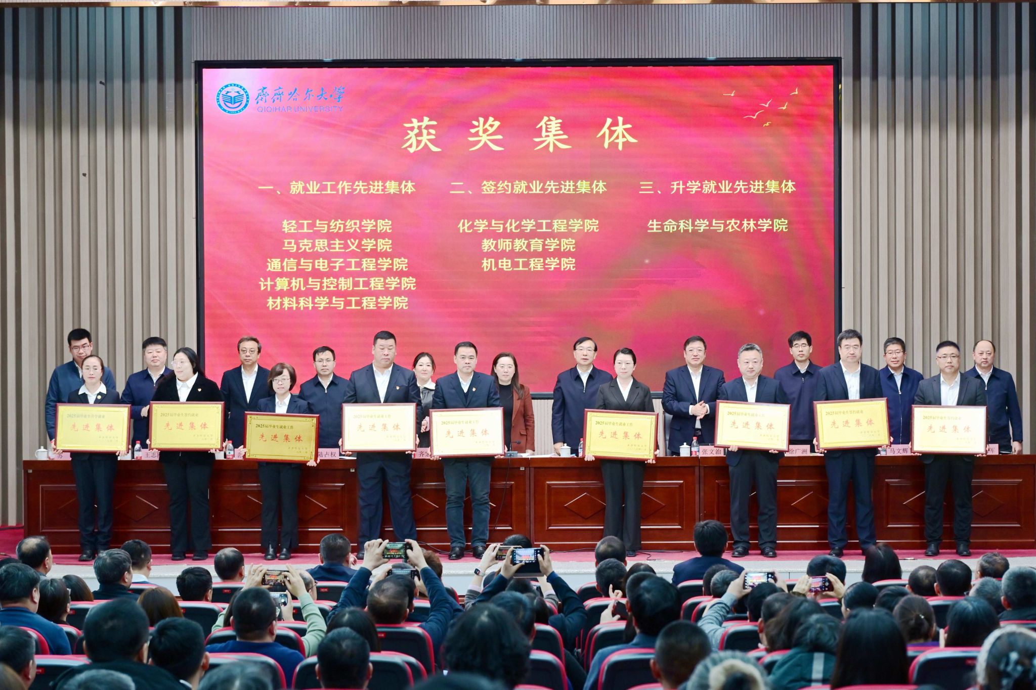 會上,機電工程學(xué)院、化學(xué)與化學(xué)工程學(xué)院、生命科學(xué)與農(nóng)林學(xué)院、通信與電子工程學(xué)院、文學(xué)與歷史文化學(xué)院(新聞傳播學(xué)院)代表分別作了交流發(fā)言。并對2025屆就業(yè)工作作出突出貢獻(xiàn)的先進(jìn)集體和個人進(jìn)行了表彰。