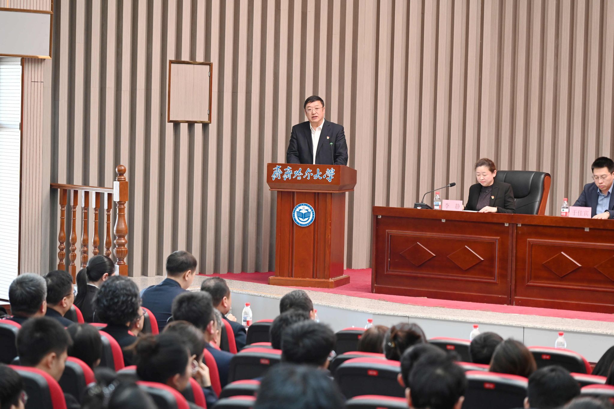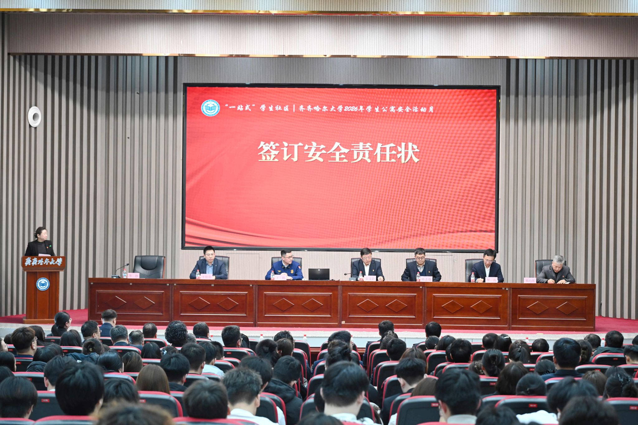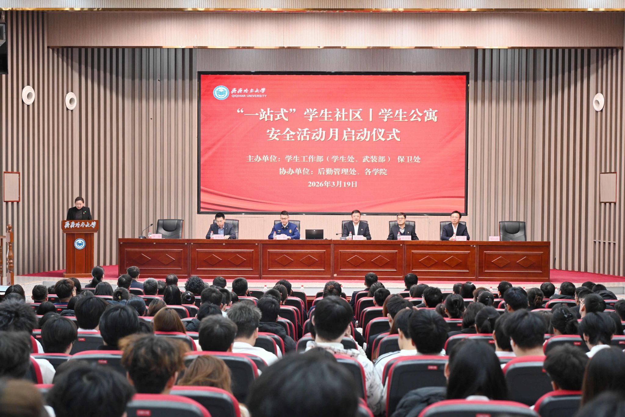 啟動儀式在莊嚴的國歌中正式開始。學生工作部(學生處、武裝部)部(處)長羅霄宣讀了《“一站式”學生社區(qū)丨齊齊哈爾大學2026年學生公寓安全活動月實施方案》,明確活動目標、內(nèi)容與安排。