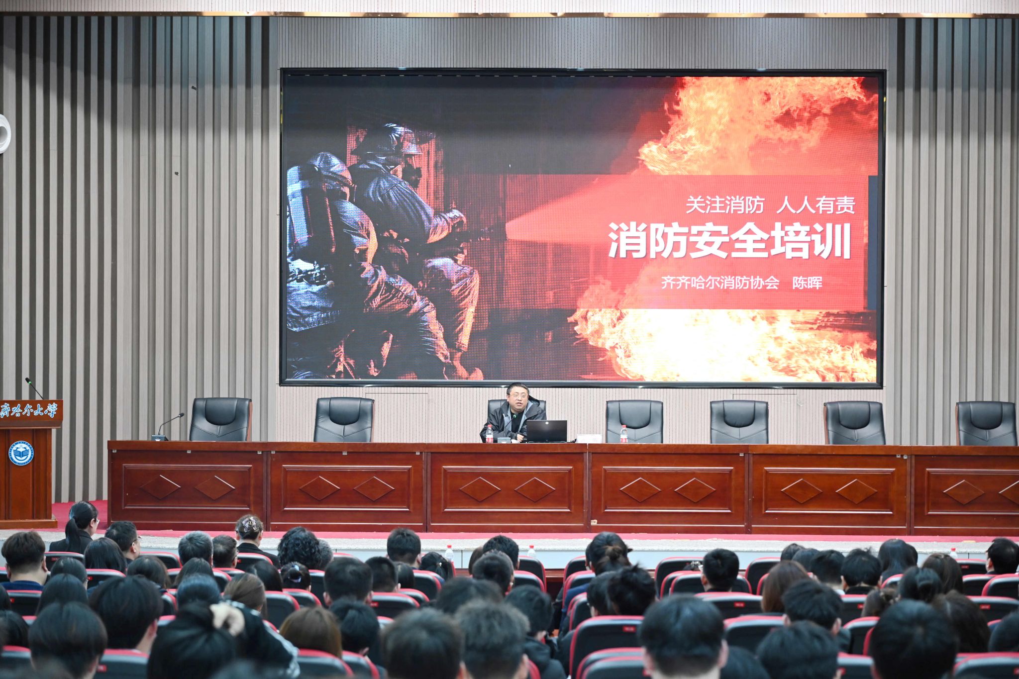 啟動儀式后,學校特邀齊齊哈爾市消防協(xié)會黨支部書記陳暉作《關注消防人人有責》主題消防安全培訓。陳暉結(jié)合典型火災案例,深入分析火災成因、危害與防控要點,通過視頻演示、實操講解,讓師生直觀掌握火災報警、初期撲救、應急逃生等基本技能,有效提升消防安全意識與自防自救能力。