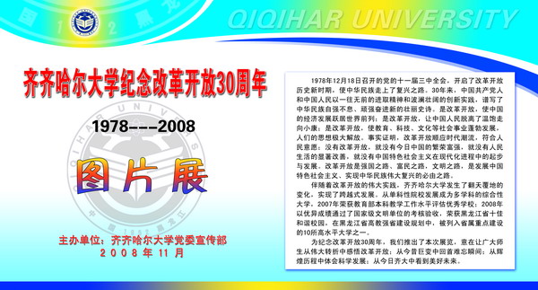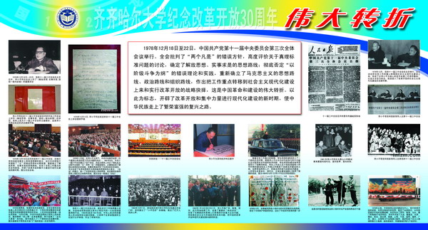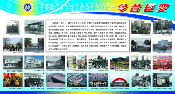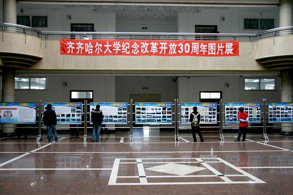 在紀(jì)念改革開放30周年之際,校黨委宣傳部在西區(qū)主樓陽光大廳舉辦了“齊齊哈爾大學(xué)紀(jì)念改革開放30周年圖片展”。本次展覽,意在讓廣大師生從偉大轉(zhuǎn)折中感悟改革開放;從今昔巨變中回首難忘瞬間;從輝煌歷程中體會科學(xué)發(fā)展;從今日齊大中看到美好未來。