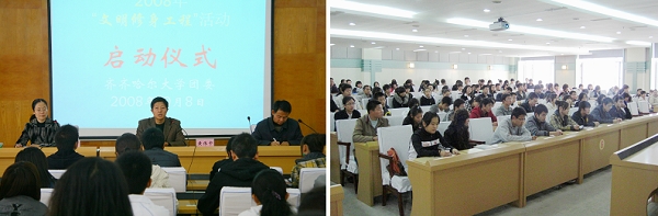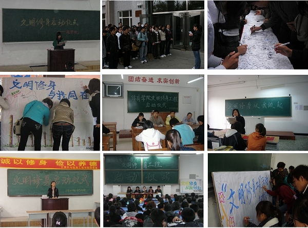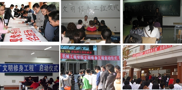 在校團(tuán)委舉行“文明修身工程”啟動(dòng)儀式的同時(shí),各學(xué)院分團(tuán)委也以學(xué)習(xí)、貫徹《2008年“文明修身工程”方案》為起點(diǎn),通過(guò)集體簽名、宣誓、召開(kāi)座談會(huì)等多種形式啟動(dòng)了本學(xué)院的文明修身工程,4000余名學(xué)生參加了啟動(dòng)儀式,由此拉開(kāi)了我校2008年“文明修身工程”的序幕。
