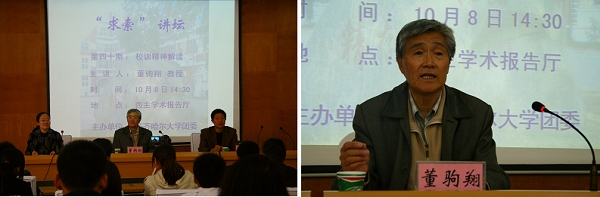 “文明修身工程”啟動(dòng)儀式后,學(xué)校老科協(xié)董駒翔教授應(yīng)邀主講第四十期“求索”講壇,為參加啟動(dòng)儀式的團(tuán)學(xué)干部做了題為《校訓(xùn)精神解讀》的專題講座。