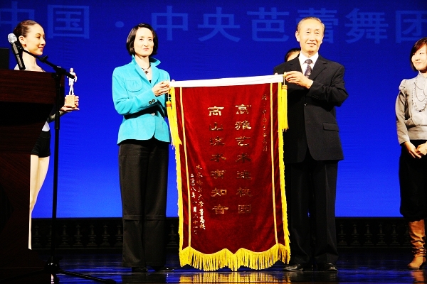 唱江華校長代表學校親手將寫有“高雅藝術進校園 高山流水有知音”的錦旗贈予中央芭蕾舞團,馮英副團長也代表中央芭蕾舞團將該團演出的經(jīng)典之作《紅色娘子軍》的舞蹈造型的微型雕塑回贈給我校。