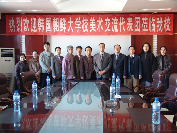 韓國(guó)朝鮮大學(xué)校美術(shù)大學(xué)藝術(shù)交流團(tuán)金鐘京教授代表藝術(shù)團(tuán)一行作了發(fā)言。他對(duì)我校的熱情接待及我校為本次美展所做的工作與努力表示感謝,他說兩校間的友好合作與交流將不斷得到加強(qiáng)并不斷拓展新的空間,他祝愿我校越辦越好。簡(jiǎn)短的會(huì)談結(jié)束后,賓主雙方互贈(zèng)紀(jì)念禮品,并合影留念。