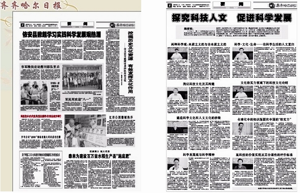 7月31日出版的《齊齊哈爾日報》要聞版對此次學術會議情況作了熱忱報道。8月5日出版的《齊齊哈爾日報》要聞版專版遴選了清華大學盧風教授、華南理工大學彭紀南教授、華中科技大學萬小龍教授、中國科學院孟建偉教授、浙江工商大學徐炎章教授、武漢理工大學楊懷中教授、東南大學呂乃基教授、齊齊哈爾大學王樹松教授等8位專家的《高科技的價值實現(xiàn)及其合理性的評價標準》等8篇代表性學術論文,以圖文并茂的形式作了題為“探究科技人文 促進科學發(fā)展”的整版的大篇幅報道,產生了積極而廣泛的社會影響。