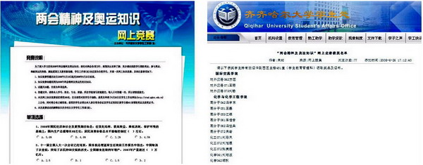 為使廣大學(xué)生深化對(duì)今年“兩會(huì)”各項(xiàng)方針、政策的認(rèn)識(shí)和了解,更廣泛地普及奧運(yùn)知識(shí),充分調(diào)動(dòng)我校學(xué)生喜迎奧運(yùn)、參與奧運(yùn)、支持奧運(yùn)的熱情,掀起愛國主義教育新高潮,學(xué)生工作處(部)于5月10日起面向全校學(xué)生開展了一次網(wǎng)上知識(shí)競(jìng)賽。