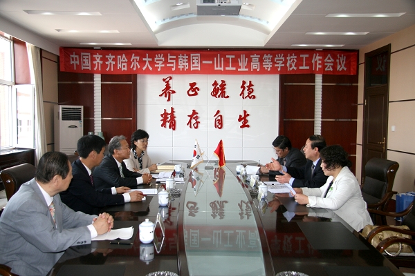 會上,副校長曲偉建首先對來訪的一山高等學(xué)校代表團(tuán)一行表示歡迎并向客人介紹了我校開展對外合作辦學(xué)的情況。韓國一山工業(yè)高等學(xué)校校長金鶴鎮(zhèn)先生對我校的熱情接待表示歡迎。雙方就兩校合作辦學(xué)及教育交流等相關(guān)事宜進(jìn)行了友好深入的探討和協(xié)商。