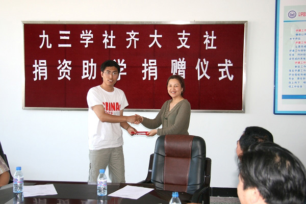 捐贈儀式上,張振民介紹了受助學(xué)生楊立同學(xué)的家庭背景及在校學(xué)習(xí)情況,對該同學(xué)不為貧苦所羈絆、只求日新而自強(qiáng)的精神給予了充分的肯定。宋波主委、石志國支委代表九三學(xué)社齊大支社向楊立同學(xué)進(jìn)行了捐贈,并對他提出了殷切的希望。