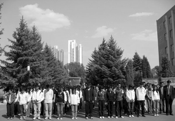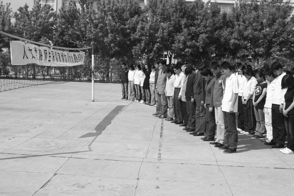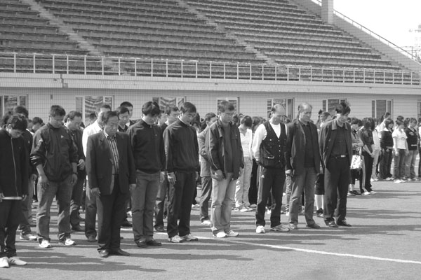 在校的校領導王鳳琴、曲偉建、鄭喜群、呂曉輝與萬名師生同殤。副校長曲偉建在中區(qū)主樓前主持了集體默哀儀式。他指出:“今天我們?nèi)T谶@里舉行集體哀悼,以表達對汶川大地震遇難同胞的深切緬懷和追思,愿逝者安息,生者堅強?!?/p>