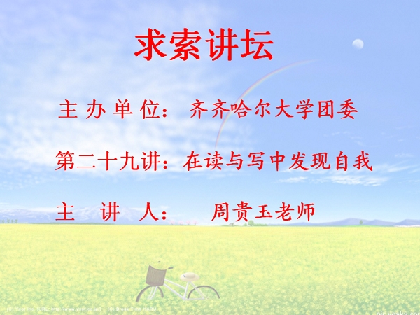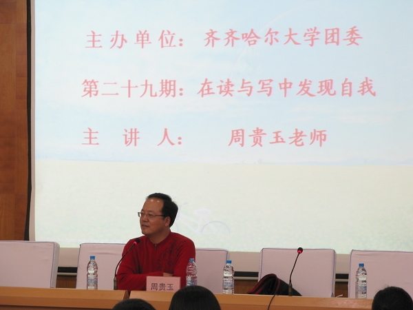 11月14日下午,由齊齊哈爾大學(xué)團(tuán)委主辦的第29期“求索”講壇在西主學(xué)術(shù)報(bào)告廳舉行。本期講座的題目是“在讀與寫中發(fā)現(xiàn)自我”,《青年文學(xué)家》雜志社主編周貴玉老師擔(dān)任本次講座的主講。我校校院兩級文學(xué)社及200多名文學(xué)愛好者聽取了講座,校團(tuán)委副書記李秀梅主持了本期“求索”講壇。