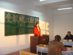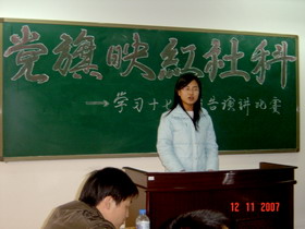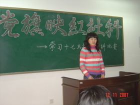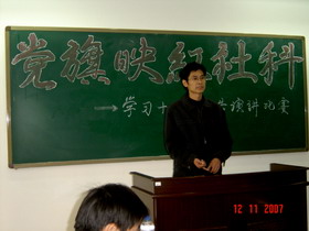 社科部非黨的碩士研究生登臺(tái)演講。演講者緊緊圍繞黨的十七大報(bào)告并結(jié)合實(shí)際,暢談了學(xué)習(xí)十七大精神的體會(huì)和心得,表達(dá)了社科部研究生學(xué)子們心向黨、熱愛(ài)黨的心聲。