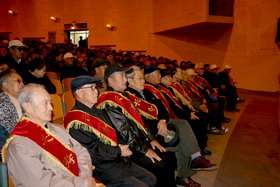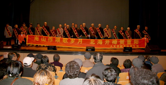 離退休工作處副處長韓樹勤主持了慶祝大會,并宣讀了我校離退休教職工中80周歲以上長壽老人名單;校領(lǐng)導(dǎo)唱江華、史鐵成、曲偉建與人文學(xué)院學(xué)生代表一起為參加大會的長壽老人佩戴了綬帶,表達(dá)了全體師生的尊敬之情。80周歲以上長壽老人代表身披綬帶,在主席臺上接受師生們的真誠祝福。