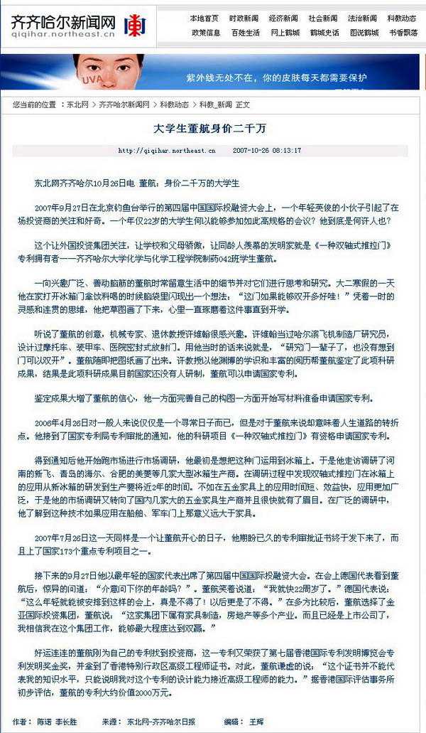 編者按:我?;瘜W與化學工程學院制藥工程專業(yè)042班學生董航的國家專利發(fā)明《一種雙軸式推拉門》榮獲了第七屆香港國際專利發(fā)明博覽會專利發(fā)明獎的金獎,他本人獲得了香港特別行政區(qū)高級工程師證書。2007年7月26日,董航同學接到了國家專利局的專利審批證書,并且成為了國家173個重點專利項目之一。9月27日,董航在北京釣魚臺舉行的第四屆中國國際投融資大會上選擇了投資商。據(jù)香港國際評估事務所初步評估,董航的專利約值2000萬元人民幣。10月26日的《齊齊哈爾日報》、齊齊哈爾新聞網對此進行了熱忱報道。