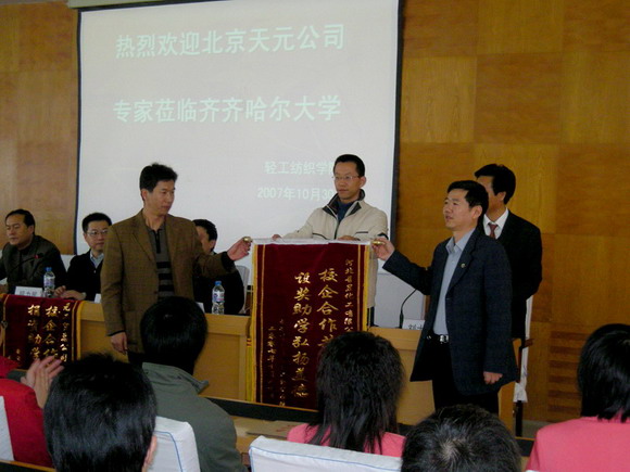 輕工紡織學院黨委書記張曉慧、院長趙欣代表學院向天元公司段立民總經理贈送了“校企合作共譜華章 捐資助學德澤學子”的錦旗;向普昱公司劉貴宏經理贈送了“校企合作共謀發(fā)展設獎助學弘揚美德”的錦旗。