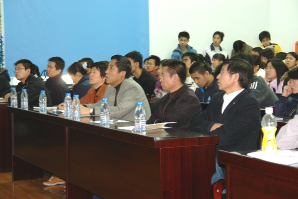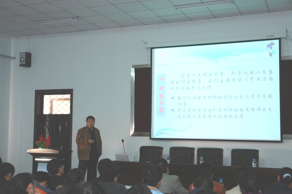 付宏剛教授從能源危機和環(huán)境污染角度闡述了光電功能半導體材料研究的必要性,介紹了他領導的課題組的研究方向及成果,包括系列新型結構TiO2光催化劑、一維結構TiO2和ZnO納米材料的控制合成等。報告會上,付宏剛教授與我院師生進行了面對面的交流,收到了良好的效果。