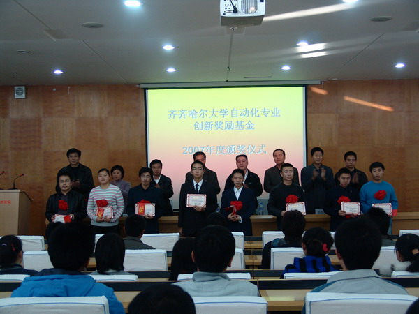 頒獎(jiǎng)儀式上,與會(huì)領(lǐng)導(dǎo)和谷闖先生共同為獲獎(jiǎng)學(xué)生頒發(fā)了獎(jiǎng)金。自動(dòng)化專業(yè)04級(jí)、05級(jí)共有8名學(xué)生獲得了獎(jiǎng)勵(lì)。
