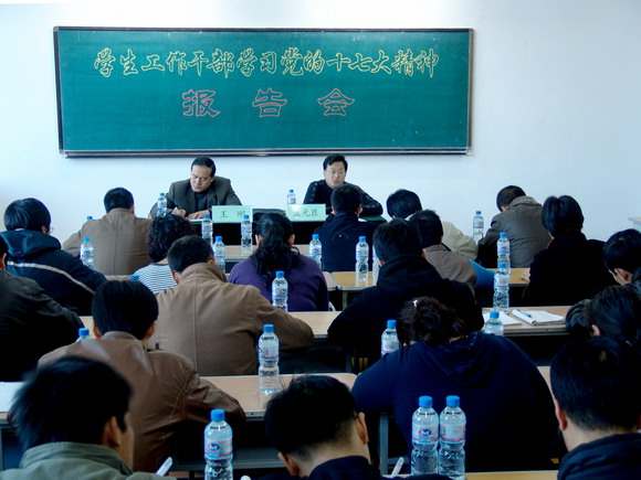 11月14日上午,為了更好地學(xué)習(xí)、宣傳、貫徹黨的十七大精神,深入落實黨的十七大提出的各項戰(zhàn)略任務(wù),激勵廣大學(xué)生工作干部以高度的政治責(zé)任感和飽滿的工作熱情做好學(xué)生工作,學(xué)校在西區(qū)教學(xué)主樓440室召開了“學(xué)生工作干部學(xué)習(xí)黨的十七大精神輔導(dǎo)報告會”。