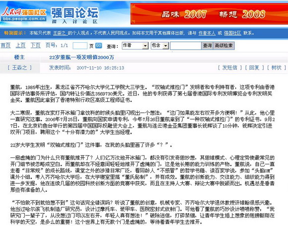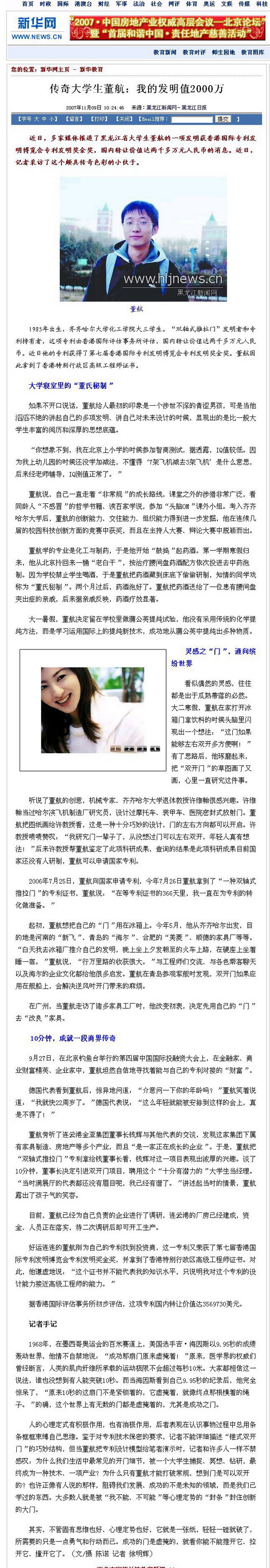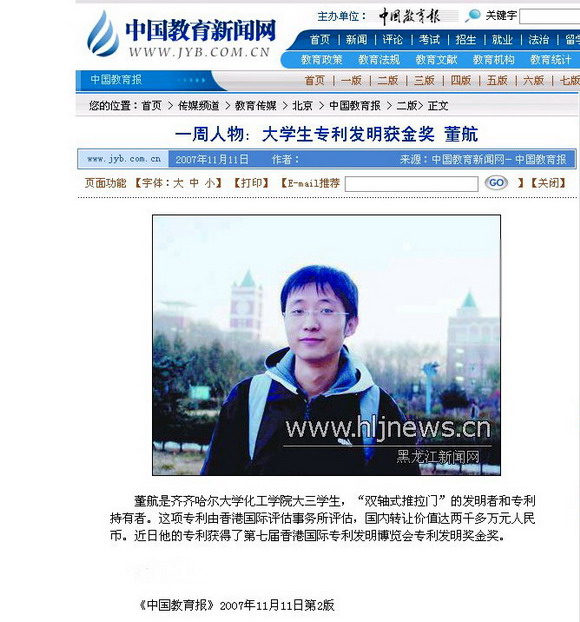 2007年11月11日的《中國(guó)教育報(bào)》第2版上刊登了董航同學(xué)的大幅照片,并配發(fā)文字說(shuō)明,將“大學(xué)專利發(fā)明獲金獎(jiǎng)—董航”醒目地列為了“一周人物”。