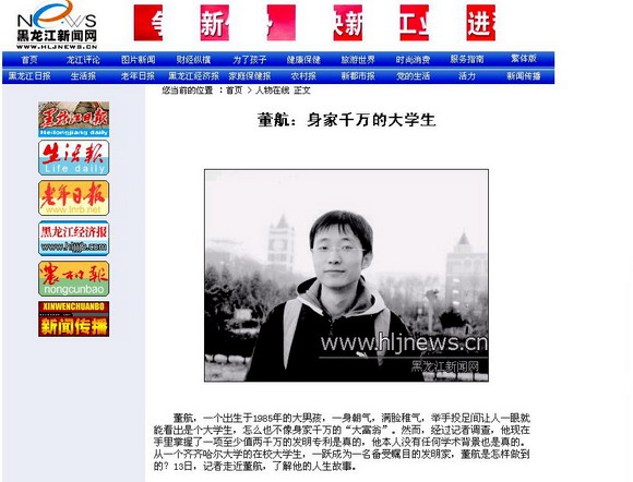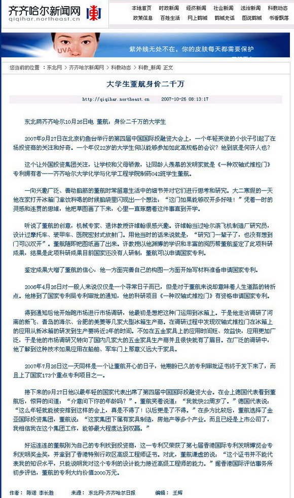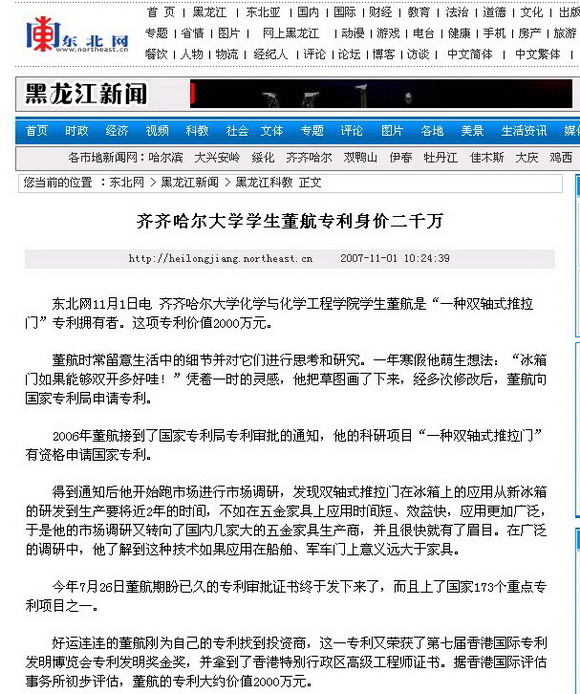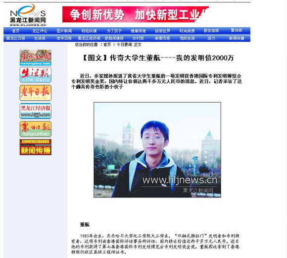 《黑龍江日?qǐng)?bào)》記者徐明輝專程從哈市來(lái)校專訪董航同學(xué),并用如椽妙筆撰寫了《傳奇大學(xué)生董航—我的發(fā)明值2000萬(wàn)》,并配圖發(fā)表在2007年11月9日出版的《黑龍江日?qǐng)?bào)》上。
