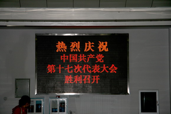 在東區(qū)人文樓、學生指導中心大廳,中區(qū)和西區(qū)教學主樓,以及西區(qū)主樓前的電子顯示屏上,均能清晰看見“熱烈慶祝黨的十七大勝利召開”等宣傳口號;