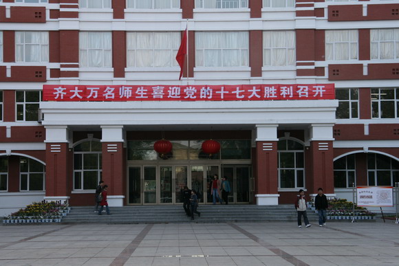東、中、西、南四個校區(qū),“齊大萬名師生喜迎黨的十七大勝利召開”等標語十分醒目。