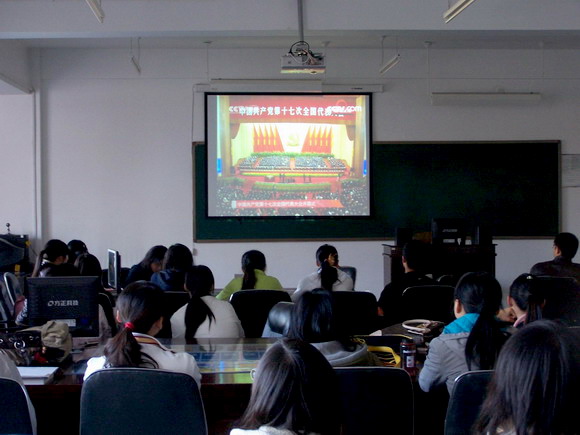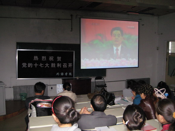 外語學(xué)院在黨委書記馮覺華的主持下,于10月17日下午再次組織全體教職員工和學(xué)生黨員在二樓階梯教室集中觀看中國共產(chǎn)黨第十七次全國代表會開幕式盛況,聆聽胡錦濤總書記代表第十六屆中央委員會向大會作題為《高舉中國特色社會主義偉大旗幟為奪取全面建設(shè)小康社會新勝利而奮斗》的報告。全體教職工看的認真,聽的仔細;學(xué)生黨員紛紛用筆記錄下學(xué)習(xí)要點和點滴體會。會后,馮覺華要求各基層黨總支、黨支部和廣大師生要緊密聯(lián)系思想和實際,進行認真地討論,為下一階段深入學(xué)習(xí)奠定堅實基礎(chǔ)。