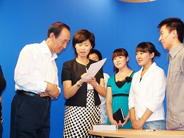 敬一丹饒有興致地觀摩了正在進(jìn)行實(shí)訓(xùn)活動(dòng)的新聞學(xué)專業(yè)學(xué)生的播音主持訓(xùn)練,并現(xiàn)場進(jìn)行了指導(dǎo)。在場的教育與傳媒學(xué)院學(xué)生就新聞工作者的職責(zé)、傳媒產(chǎn)業(yè)的發(fā)展前景、新聞學(xué)專業(yè)學(xué)生應(yīng)如何鍛煉和提高自己等問題與敬一丹進(jìn)行了廣泛的交流,許多學(xué)生請(qǐng)敬老師簽名并合影留念,現(xiàn)場氣氛熱烈、活躍。李虹院長代表全院師生,向她贈(zèng)送了學(xué)生自己制作的敬一丹節(jié)目專輯和學(xué)生社會(huì)實(shí)踐活動(dòng)視頻集錦。敬一丹對(duì)我校的學(xué)生實(shí)踐活動(dòng)和實(shí)驗(yàn)室建設(shè)給予了較高評(píng)價(jià),并欣然題寫了“祝福未來的同行”贈(zèng)送給教育與傳媒學(xué)院的全體師生。