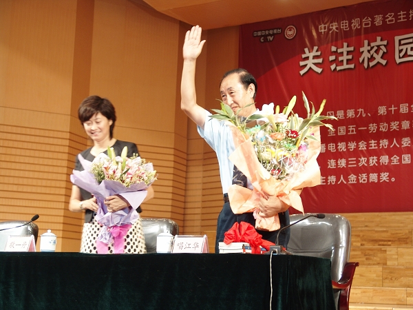 9月13日上午,中央電視臺(tái)著名節(jié)目主持人,全國第九、第十屆政協(xié)委員,全國五一勞動(dòng)獎(jiǎng)?wù)芦@得者,中國廣播電視學(xué)會(huì)主持人委員會(huì)副理事長,連續(xù)三屆全國電視十佳節(jié)目主持人金話筒獎(jiǎng)得主敬一丹女士應(yīng)邀來訪我校。 校領(lǐng)導(dǎo)唱江華、史鐵成、王鳳琴、張學(xué)軍、曲偉建、姜守訓(xùn)、鄧啟剛、呂曉輝等到學(xué)校中區(qū)門前迎接敬一丹女士的到來。