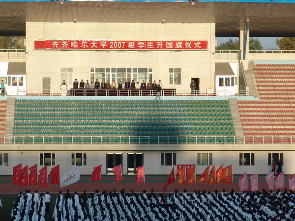 由39名軍訓(xùn)教官組成的儀仗隊(duì)、護(hù)旗手邁著整齊的步伐護(hù)送國旗到升旗臺前。莊嚴(yán)激越的國歌聲中,身著整齊服裝的同學(xué)們行注目禮,注視著國旗冉冉升起在齊齊哈爾大學(xué)校園的上空。