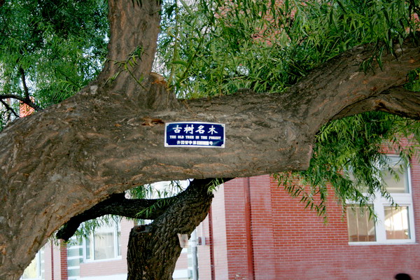 我校中區(qū)圖書館樓前的一棵造型十分美觀的大柳樹舒展著枝葉,水泥壇砌起的圍欄把大樹保護(hù)得很好。日前,經(jīng)市園林管理所工作人員鑒定,該棵大柳樹被認(rèn)定為屬古樹行列,并被掛上了“古樹名木”的銘牌,成為校園又一新人文景觀。