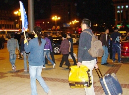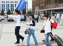 在火車站迎新接待點,我校工作人員按照學(xué)校的統(tǒng)一要求和部署,及時為剛剛走下火車的新生及家長提供周到而細致的服務(wù)。他們有的舉著寫有各院系標(biāo)志的牌子為新生及家長引路;有的為新生提供細致的咨詢,有的幫他們拿東西,有的為遠道而來的學(xué)生家長排憂解難,停放在廣場上的接送班車,為一路旅途奔波勞累的新生和家長提供免費服務(wù),將他們順利送達學(xué)校。