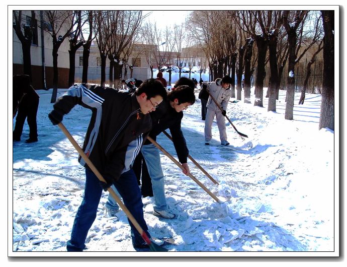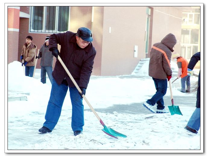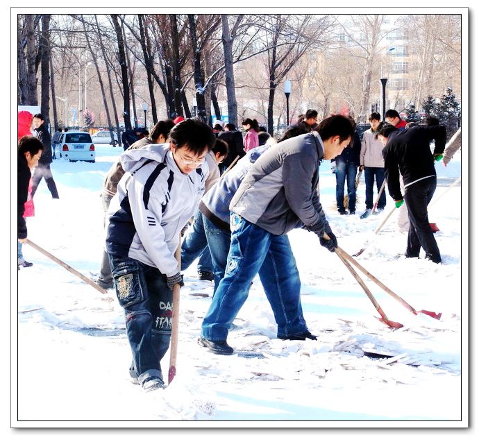后勤處副處長韓士華、經(jīng)管學(xué)院副書記、副院長鄒立堂、輕工紡織學(xué)院副院長劉世山等在積極做好組織工作的同時,也奮戰(zhàn)在清冰雪第一線,率先垂范,以身作則,與廣大師生一道為清除校園積雪、扮靚校園揮灑自己的汗水。