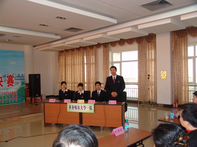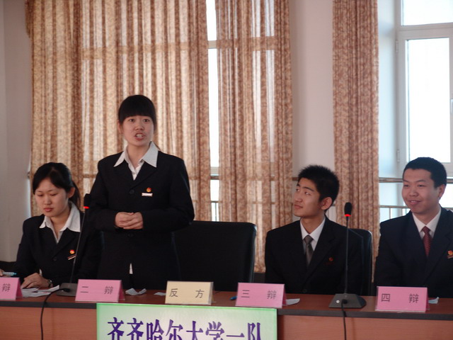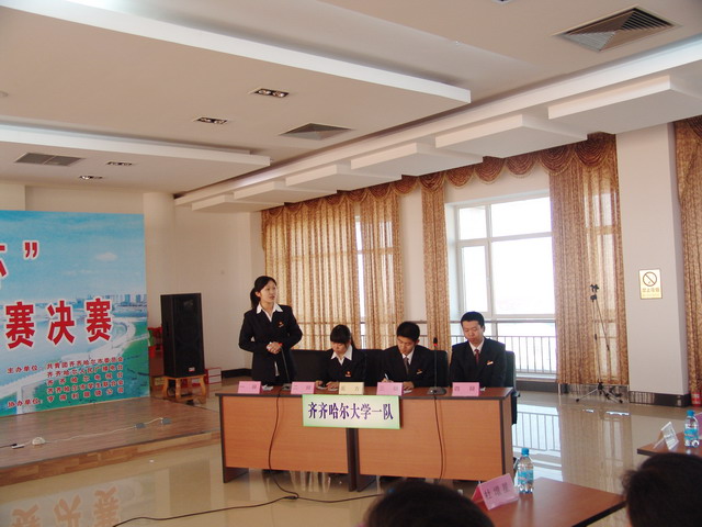 決賽上,我校由人文學(xué)院04級廣姜俊、張玉華,理學(xué)院04級林翔,生命學(xué)院04級崔學(xué)等四名辯手組成的第一代表隊(duì)與齊齊哈爾職業(yè)學(xué)院第二代表隊(duì)爭奪冠、亞軍。