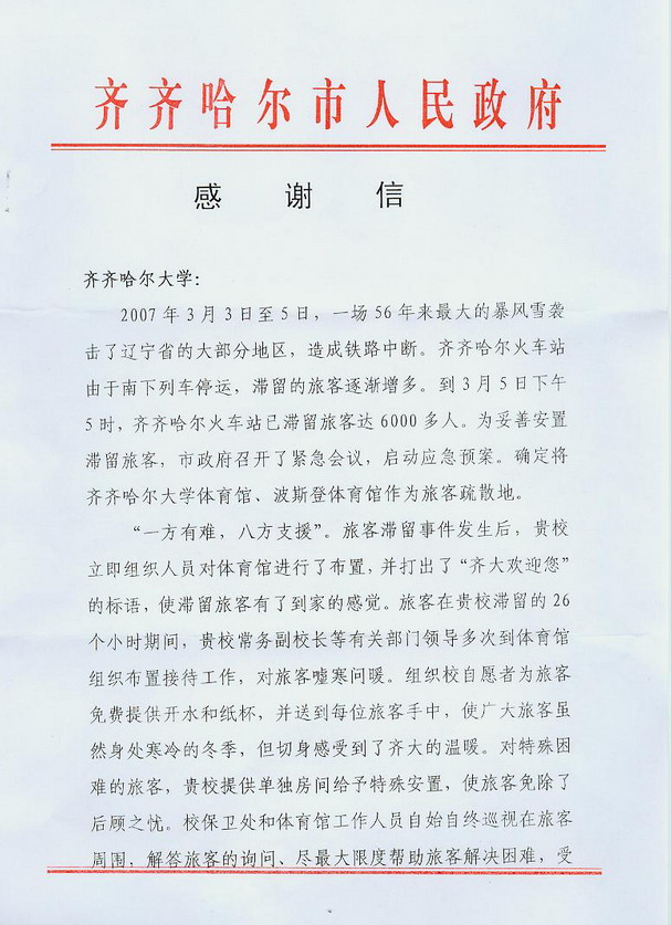 發(fā)布日期:2007-03-14 點擊量:3月14日,齊齊哈爾市人民政府向我校發(fā)來感謝信函,對我校在3月5日——7日妥善安置因風雪滯留在齊站旅客的行為“表示衷心的感謝和崇高的敬意!” “一方有難,八方支援?!痹谶@場突如其來的旅客滯留事件發(fā)生后,我校體育館被市政府緊急會議確定為旅客疏散地。