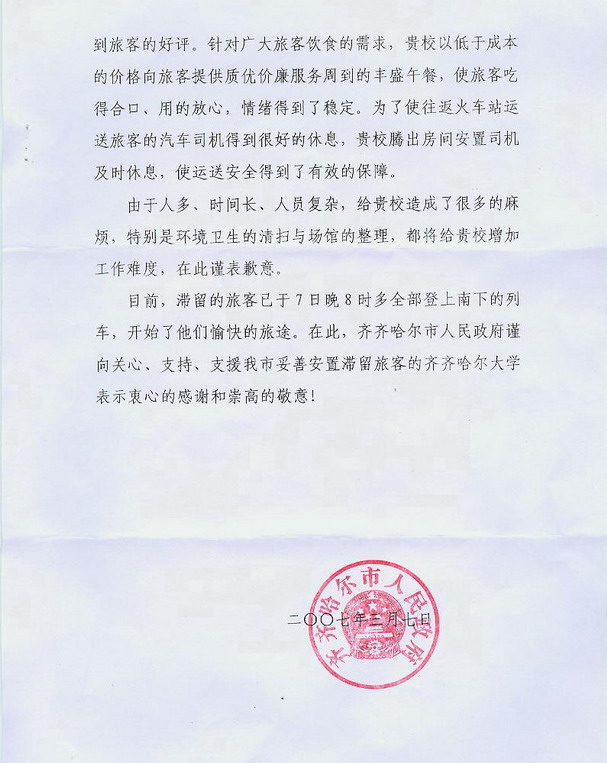 市政府致信對我校妥善安置滯齊旅客表示感謝