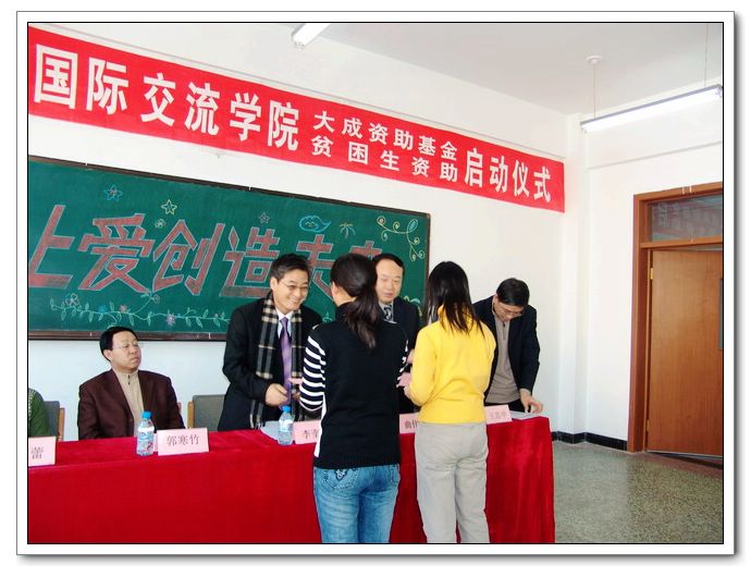 他指出,教育是一項崇高的社會公益事業(yè)。我校進(jìn)一步了資助經(jīng)濟(jì)困學(xué)生的政策和制度,并加以有效落實(shí),進(jìn)一步完善了高校綠色通道制度,使經(jīng)濟(jì)困難的大學(xué)生享有了受教育的平等權(quán)利,我校的這項工作也贏得了社會有識之士、國際友人的愛心幫助。今天,國際交流學(xué)院“大成資助基金”的創(chuàng)立,這是一項十分有意義的義舉,必將鼓舞勤奮學(xué)子們的學(xué)習(xí)熱情,也將使他們更好地完成學(xué)業(yè),貢獻(xiàn)于社會。