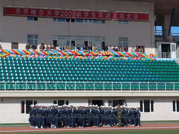 發(fā)布日期:2006-09-12 點擊量:9月10日上午,我校在西區(qū)體育場隆重召開了2006級新生軍訓(xùn)總結(jié)大會,校領(lǐng)導(dǎo)王鳳琴、曲偉建、姜守訓(xùn)、鄭喜群以及學(xué)校有關(guān)部門的領(lǐng)導(dǎo)、各學(xué)院黨委書記及承擔(dān)此次軍訓(xùn)任務(wù)的65447部隊三營副營長呂內(nèi)發(fā)等在主席臺就座。副校長鄭喜群主持了大會。