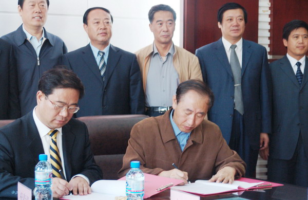 在兩校校際合作簽約儀式上,我校校長(zhǎng)唱江華教授與燕山大學(xué)校長(zhǎng)劉宏民教授分別代表雙方在兩校校際合作與人才培養(yǎng)協(xié)議文本上簽字,我市副市長(zhǎng)孫綱、馬立群與我校副校長(zhǎng)曲偉建、姜守訓(xùn)、鄭喜群、鄧啟剛等陪同考察并出席校際合作簽約儀式。
