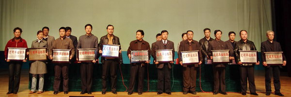 在主席臺就座的學校及市文明辦領導為榮獲校級文明單位標兵和文明單位的代表頒發(fā)了獎牌。
