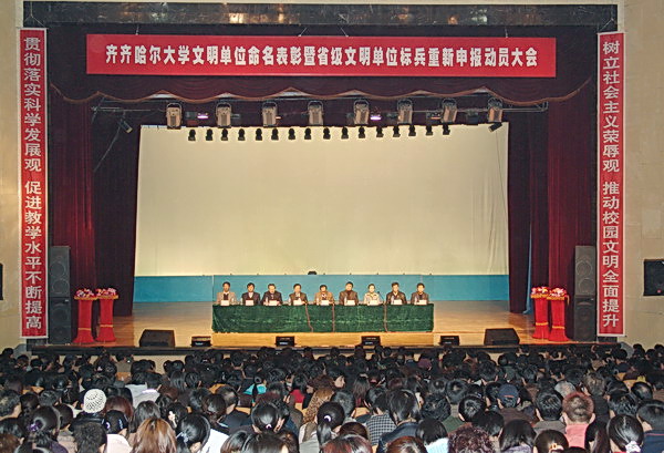 為了深入貫徹落實中央、省、市關于精神文明建設的意見和要求,貫徹落實學校《“十一五”文明單位建設規(guī)劃》,進一步提高我校文明單位建設的層次和水平,我校于4月12日下午在中區(qū)文化宮隆重召開了齊齊哈爾大學文明單位命名表彰暨創(chuàng)建省級文明單位標兵動員大會。