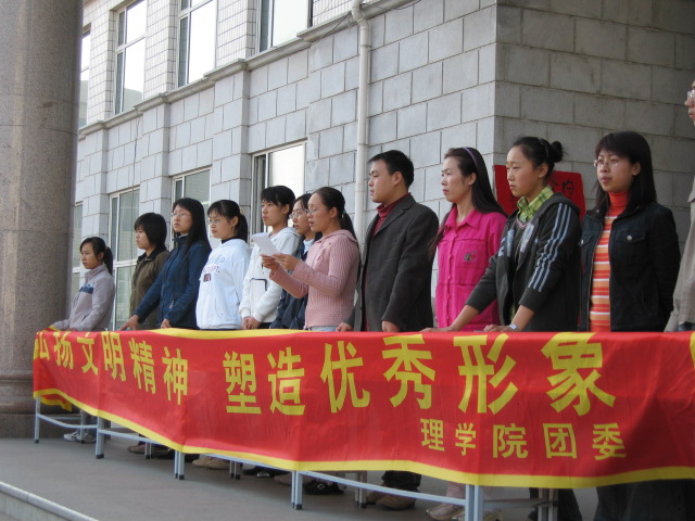 四是知行合一,注重實(shí)踐,確?;顒拥膶?shí)效性。理學(xué)院團(tuán)委在“文明修身”工程中組織開展了青年志愿者活動。青年志愿者倡導(dǎo)并認(rèn)真踐行“愛我校園,建我校園”活動,讓文明之花開遍校園,讓文明之風(fēng)風(fēng)行校園,他們組織打掃清理了學(xué)校西主樓的階梯教室、停車場和校園,組織學(xué)生清理自行車停車場,在勞動中加深了對文明修身的理解,贏得了師生們的贊譽(yù)。學(xué)院團(tuán)委因勢利導(dǎo),適時組織了以“團(tuán)結(jié)友善、溫馨和諧”為主題的新生寢室歌曲大賽、以弘揚(yáng)愛國主義為主題的升旗儀式等系列活動,寓文明于活動養(yǎng)成之中,潛移默化的熏陶和感染學(xué)生,使文明習(xí)慣成自然。如今,“說文明話、行文明事、做文明人”,正在成為大學(xué)校園里的新風(fēng)尚。